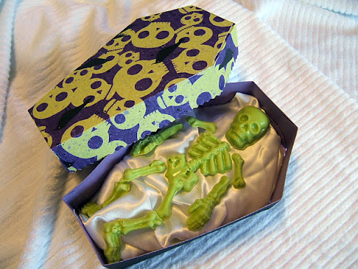 I originally wanted to just line the coffins with white satin (and batting to make it puffy) but once I ran out of green candy melts I started using white almond bark and that wouldn't show up on white satin, so I ended up putting some black lace over it. I actually like it better that way!